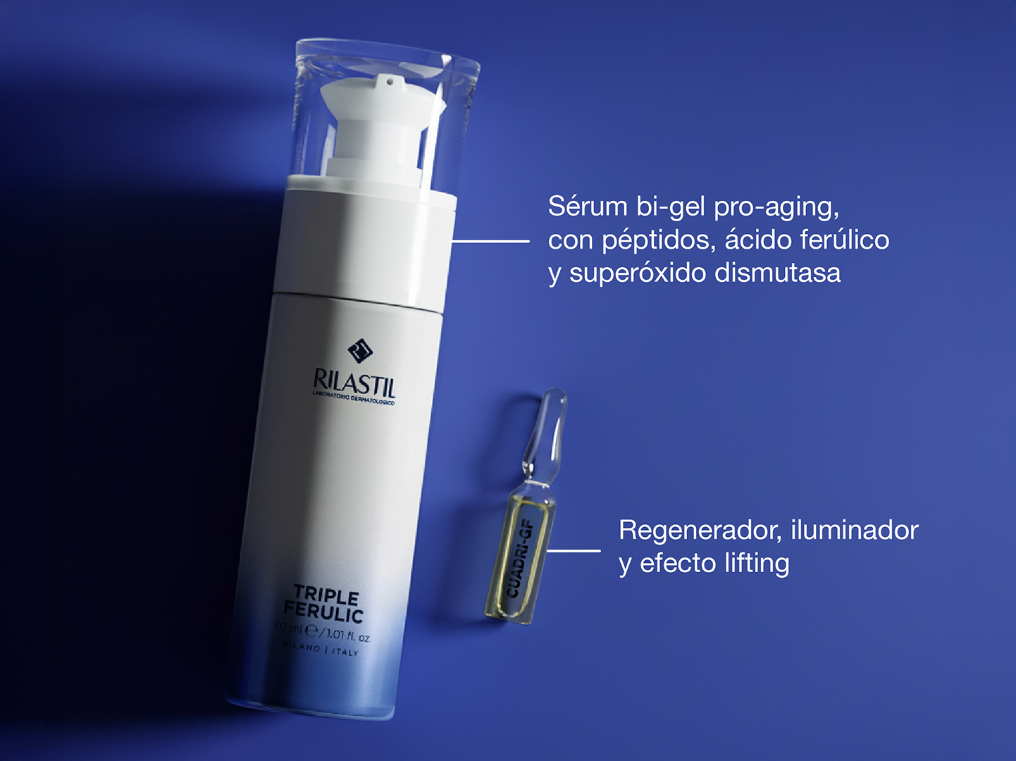 CUADRI-GF: Ácido Ferúlico, Superóxido Dismutasa, Ácido Hialurónico, Glicanos, Factores de Crecimiento Celular de origen biotecnológico