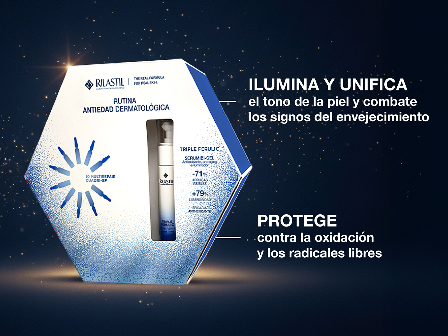 Tratamiento antiedad combina dos potentes fórmulas para mejorar visiblemente la calidad de la piel. El sérum Triple Ferulic, con péptidos, ácido ferúlico y superóxido dismutasa, ilumina y unifica el tono, reduce arrugas y líneas de expresión y proporciona una protección avanzada frente a la oxidación y los radicales libres, evitando el envejecimiento prematuro.